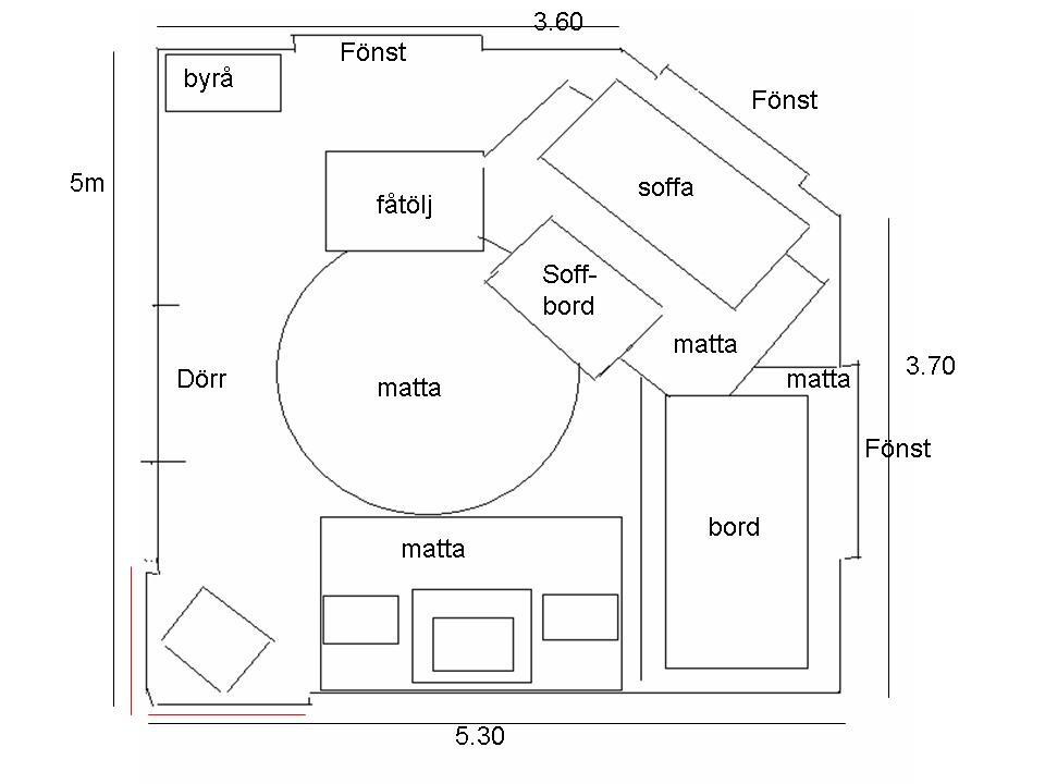 Jag har en liten fråga. I mitt vardagsrum som mäter 5.30x5.00 (men har ena hörnet avhugget och därmed är femkantigt), finns en 4-5cm djup insjunkad i det motsatta hörnet, som till skillnad från resten av rummet icke har några gipsskivor utan är av renaste betong. Från golv till tak, vilket är 3.10 minus ca 20 cm stuckatur. Detta "L" mäter 1.20x1.00m Markerat med rött nere till vänster på bilden.