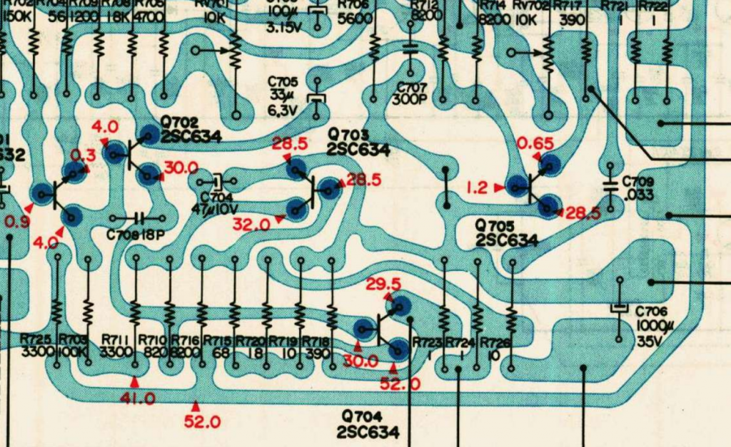 Tomgångsströmmen, bias, ska enligt manualen ställas till 15mV över R722, men på högra kanalen (där alla fel varit) går det inte att ställa den högre än ca. 8mV.