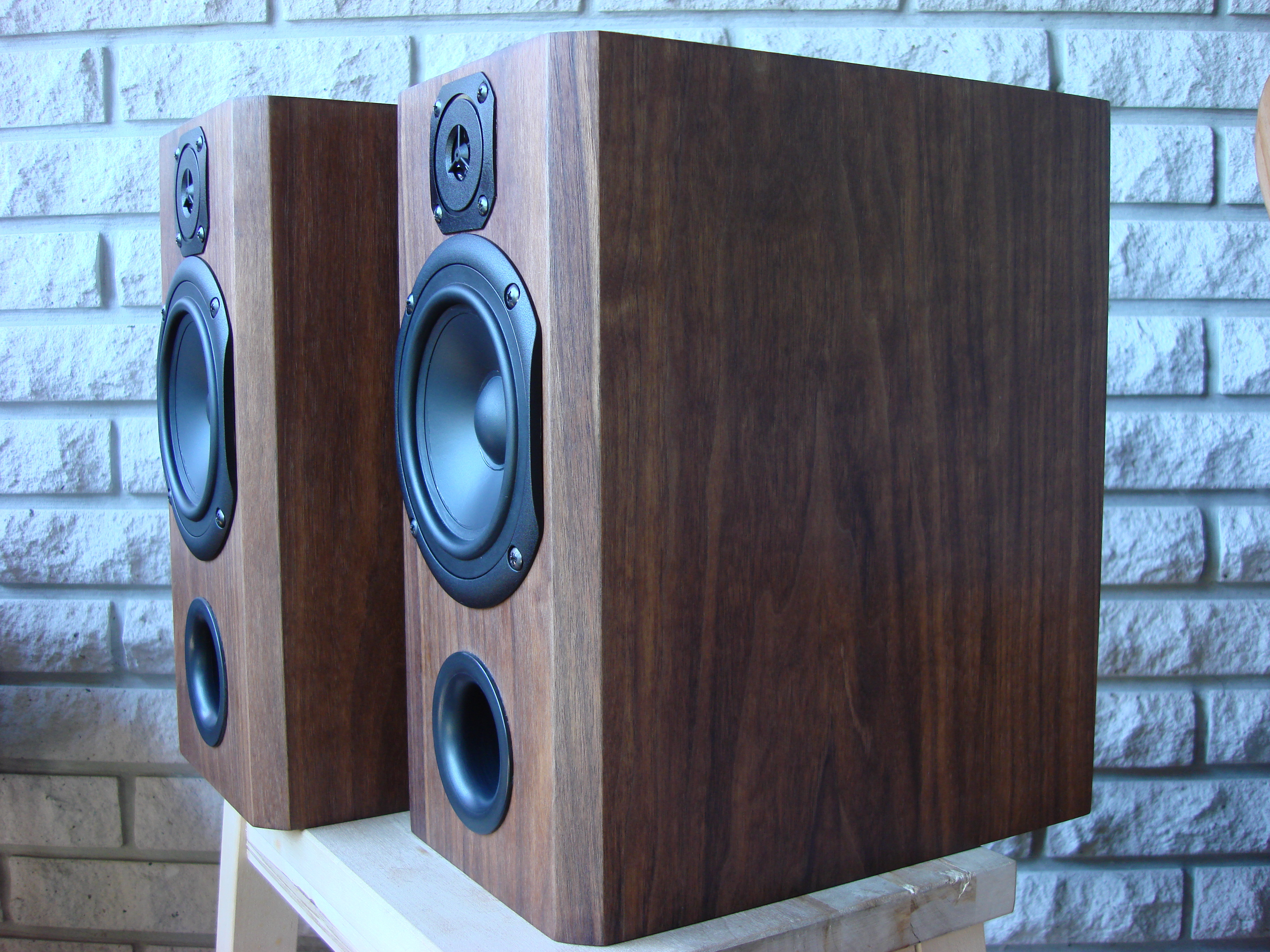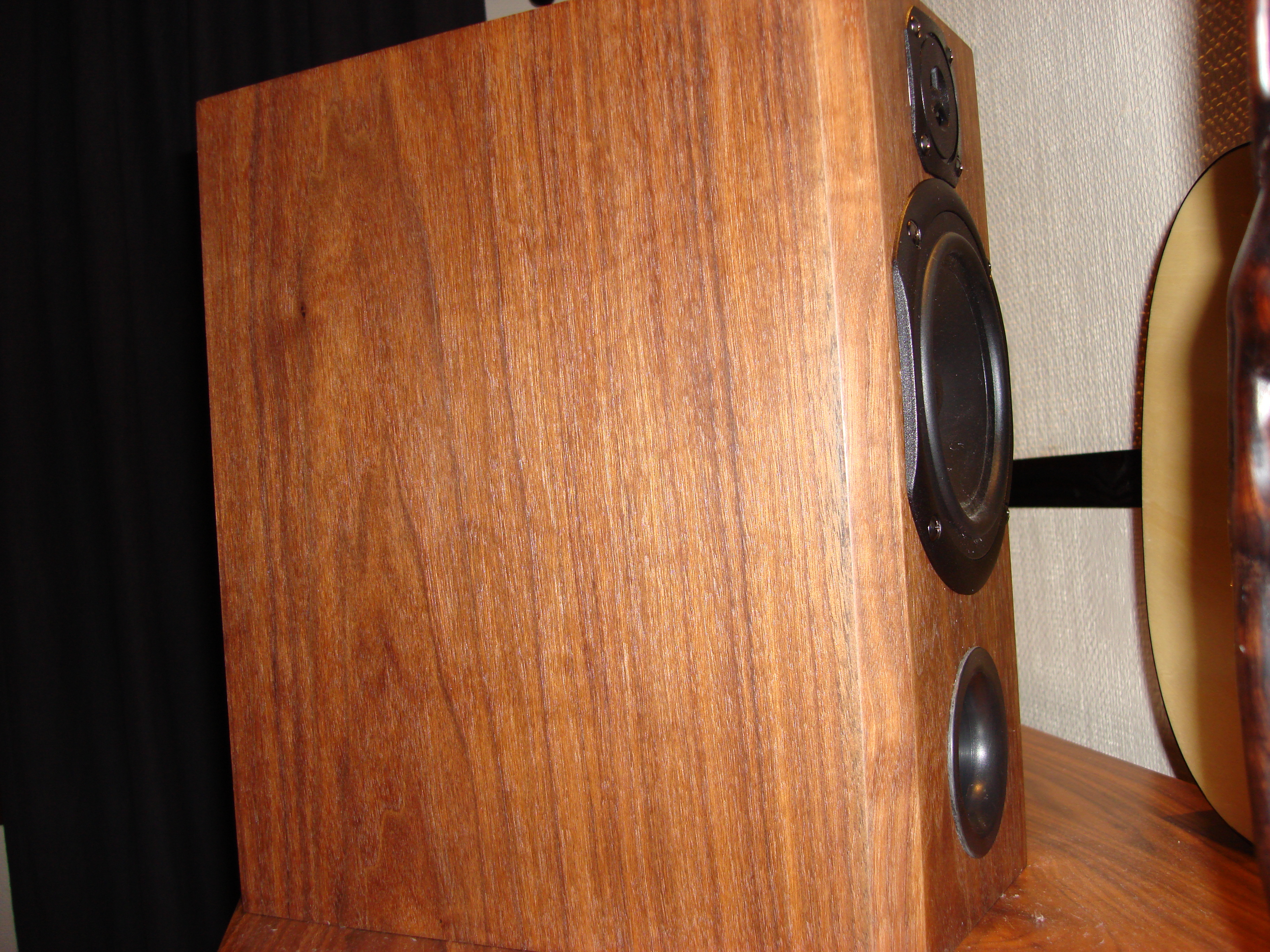 Här kommer lite bilder på de färdiga högtalarna. Det var lite svårt att få till ett ljus som gjorde finishen rättvisa. Antingen var det för ljust eller för mörkt och jag kunde inte ta med blixt för den 'slog'(reflekterades) för hårt i fanéret. Jag är ju ingen proffs-fotograf heller så det blev som det blev. Bilderna är tagna med en Sony N2 (10MP).