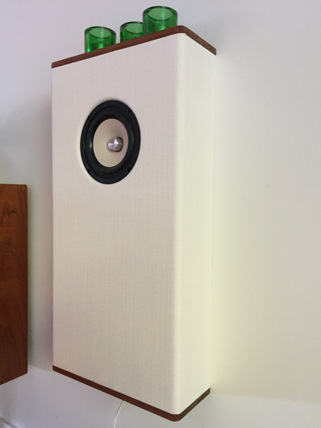 När jag fick dem kastade jag ihop ett par portade lådor på runt 12-liter som jag tror jag stämde av runt 50 Hz (jag kommer inte ihåg exakt men jag modellerade med WinISD och använde uppgifterna från TangBand). Min fru ville ha "något vitt som försvann mot väggen". Så jag gjorde ett par vägghängda högtalare som jag klädde med ett vintage-tyg och som jag sedan försåg med topp och botten av teak. Jag gjorde dem så grunda som möjligt och här är en bild på resultatet: