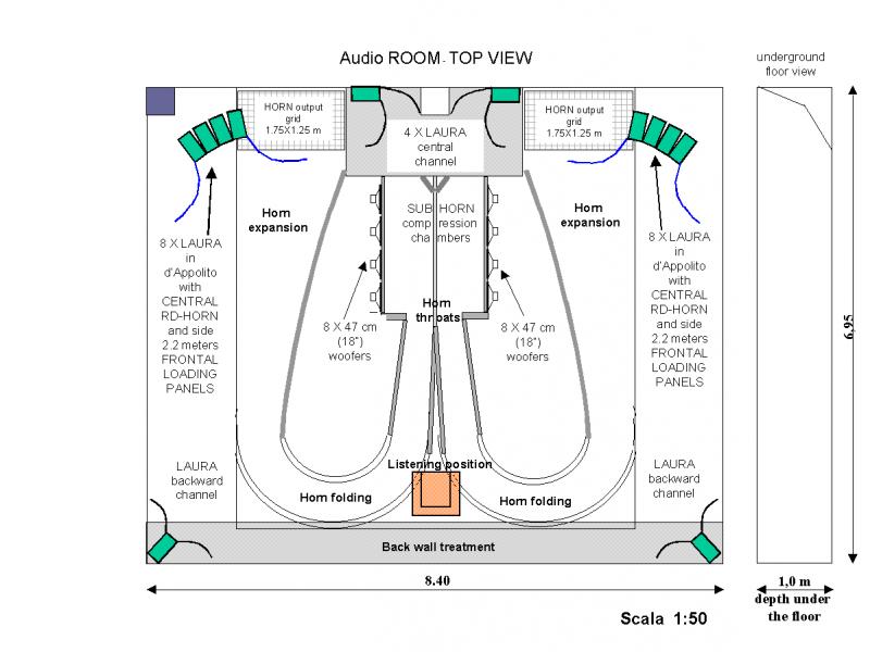 2 x 15 meter långa betonghorn som byggts in i kåken hans och ligger i källaren med hornöppningarna upp i musikrummet. Har iofs inte sett dom annat än gallren i golvet men det platsar väl i denna tråd?