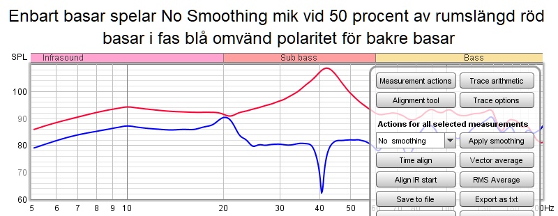 I dom osmoothade bilderna är miken vid 50,3% av "akustiska rumslängden" 88 cm över golv. Röd kurva = basar i fas, blå kurva med omvänd polaritet för bakre basarna. Tjusig peak respektive dipp vid dryga 40 Hz. Om kalibreringen som följde med Umik-miken är korrekt, så visar kurvan för låga värden under 20 Hz, stigande till 7,4 dB för lågt vid 10 Hz. 40 Hz-peaken ser gräsligt stor ut men dess utklingningstid ligger kring 330 ms för -40 dB, så den upplevs inte direkt som någon entonsbas som dönar kvar i rummet.