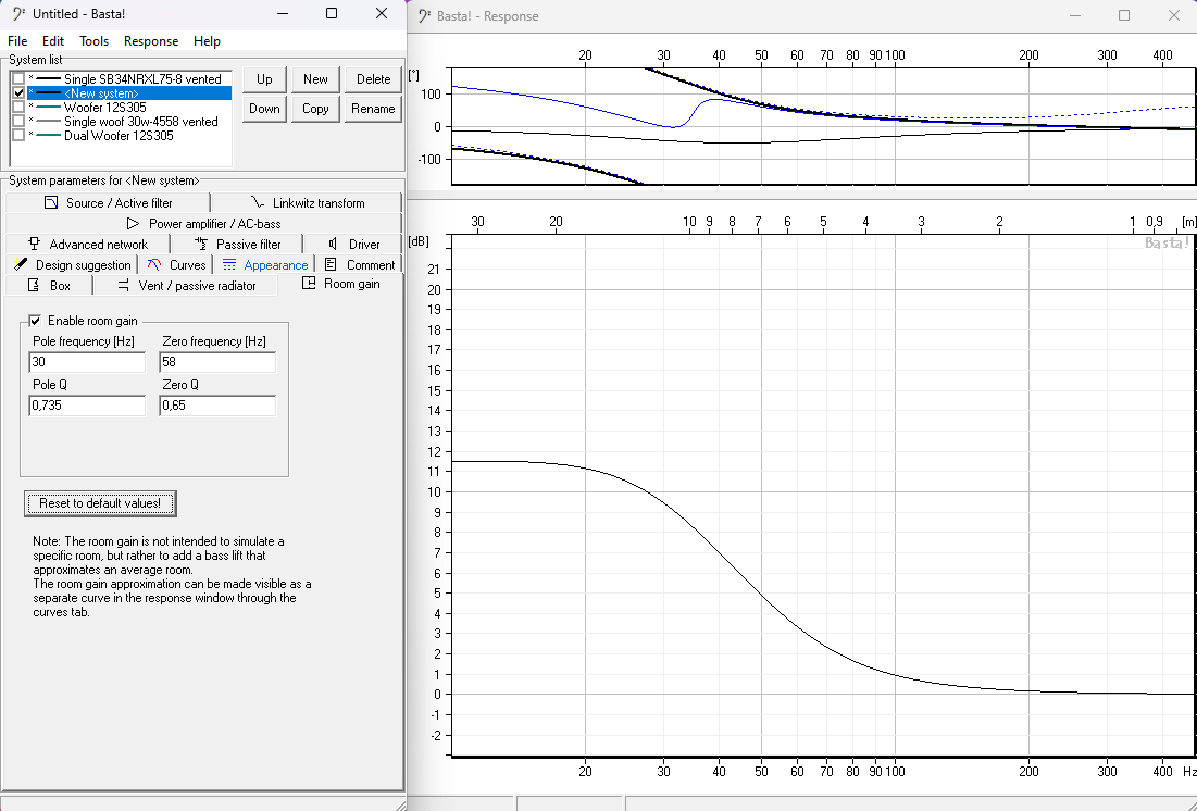 I-or skrev:Mer noggranna simuleringar visar att rumsstödet i typiska rum och uppställningar i genomsnitt är nästan konstant ned till ca 50-60 Hz för att öka snabbt mot lägre frekvenser. Svantes rumsstöd ser inte ut på det sättet i Basta.